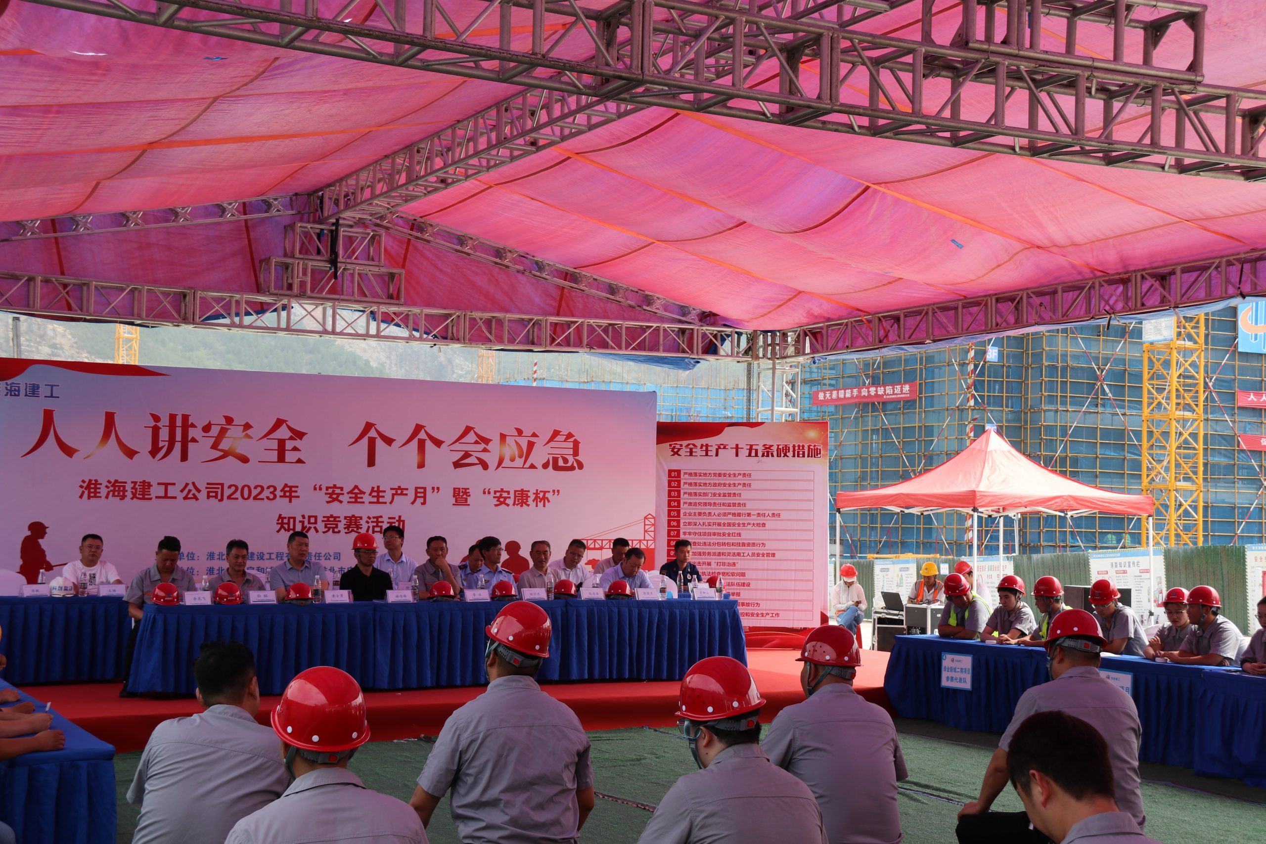 為深入貫徹落實習(xí)近平總書記關(guān)于安全生產(chǎn)工作的重要講話指示以及近期省、市、集團(tuán)安全生產(chǎn)會議精神,切實增強(qiáng)公司全體員工安全防范意識和應(yīng)急救援能力,6月20日上午,淮海建工公司在熙園項目部舉辦2023年“安全生產(chǎn)月”暨“安康杯”知識競賽活動,市住建局等相關(guān)部門領(lǐng)導(dǎo)出席活動。