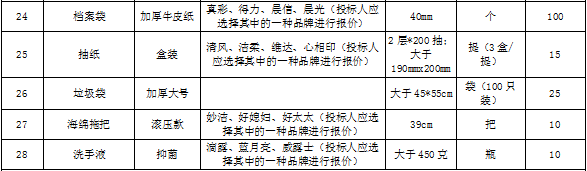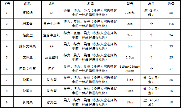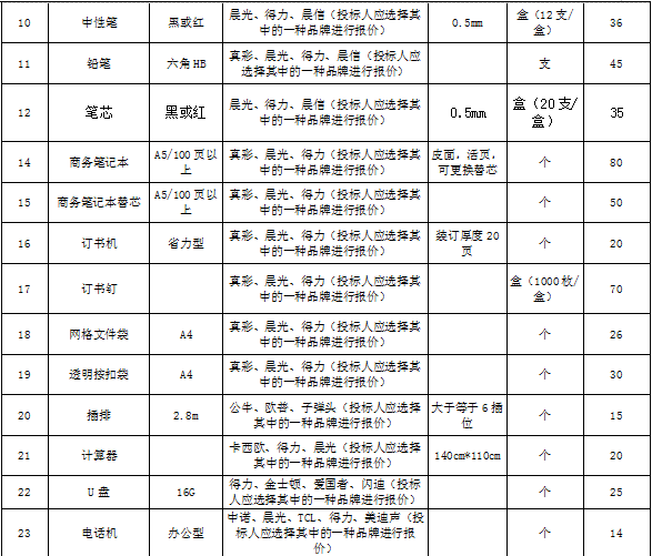 | 招標(biāo)范圍 | 包括但不限于辦公用品的生產(chǎn)供貨、包裝、運(yùn)輸、檢測、驗(yàn)收、質(zhì)保及售后服務(wù)等。如有漏項(xiàng)或缺項(xiàng),投標(biāo)人承擔(dān)全部責(zé)任。 | ||||||||||||||||