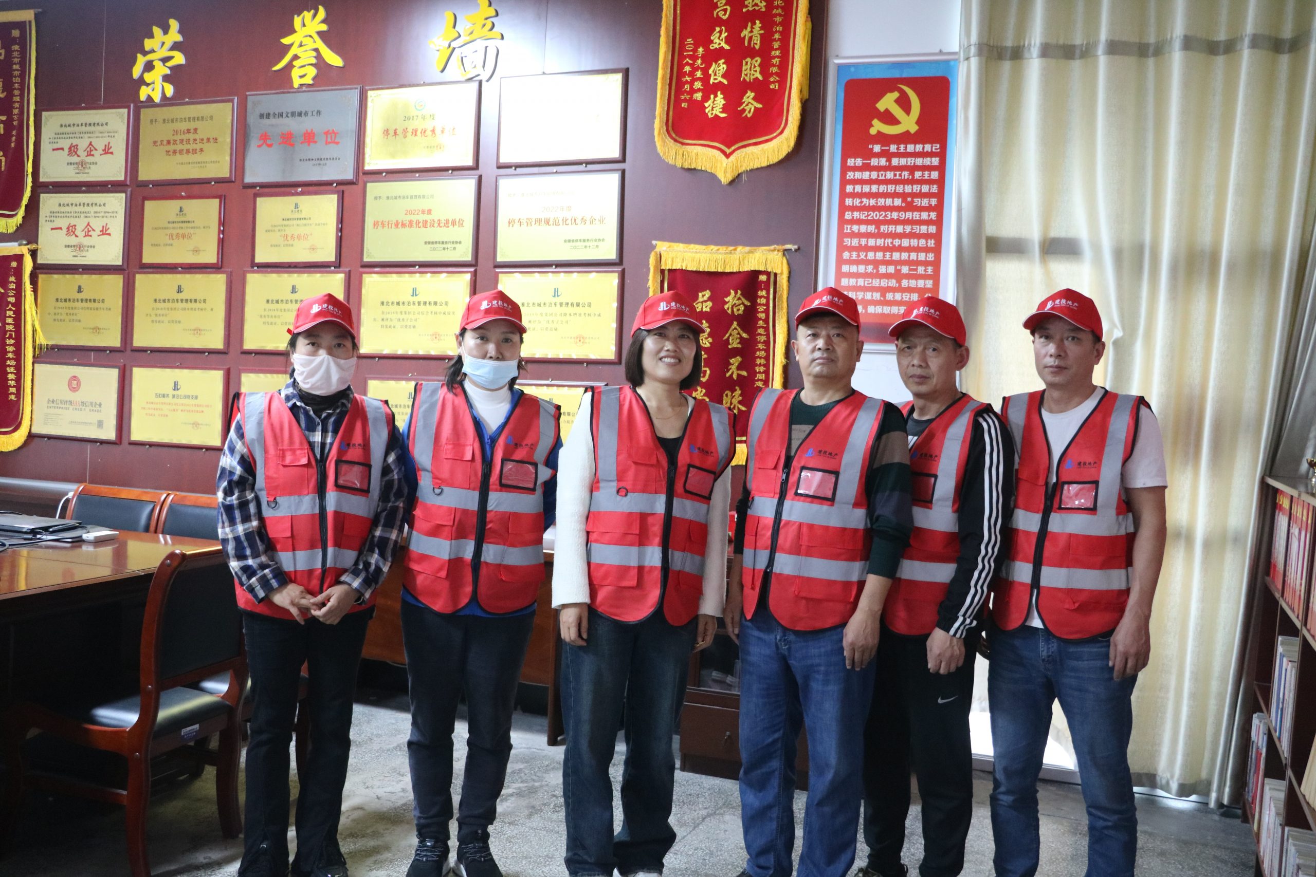 新工作服馬甲、帽子以中國(guó)紅為主色調(diào),中間相間銀色反光條,形成極大的顏色反差效果,具有更加醒目的視覺(jué)效果,增強(qiáng)了收費(fèi)員晚間或惡劣天氣工作條件下的安全性。同時(shí),衣服的背面印有公司的logo及“淮北城泊”的字樣,辨識(shí)度更高,能夠進(jìn)一步展現(xiàn)停車收費(fèi)服務(wù)的良好形象,方便更好的開展停車管理及收費(fèi)工作。