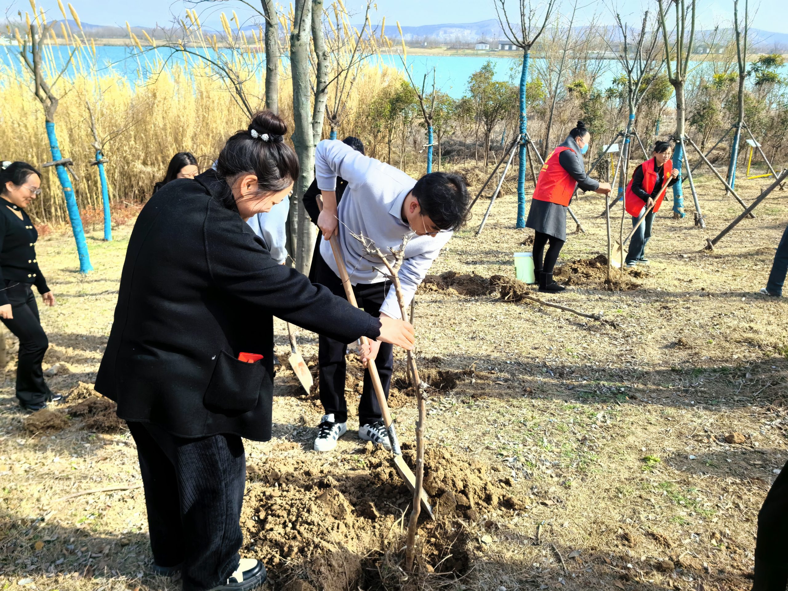 迎著微風(fēng),大家?guī)瞎ぞ?,熱情高漲、干勁十足,積極投入到植樹活動中。揮鍬鏟土、栽苗培土、踩實(shí)土壤,大家協(xié)作配合,現(xiàn)場一派火熱繁忙景象?;顒又泄苍灾?0余棵樸樹,栽種樹苗整體錯(cuò)落有致,生機(jī)盎然,為綠金湖增添了一道靚麗的風(fēng)景線。