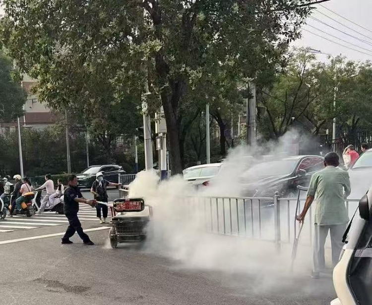 2025年6月11日上午7時41分許,淮北市保安有限公司武裝押運一中隊W699Y車組行駛至建設(shè)銀行西城支行網(wǎng)點路口時,突遇一輛三輪電動車自燃,火苗從車底迅猛竄出,騎車老人驚慌失措,周邊群眾紛紛后退。時值早高峰,車流人流密集,如不及時處置,后果不堪設(shè)想。