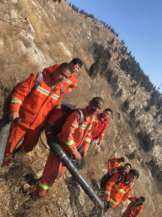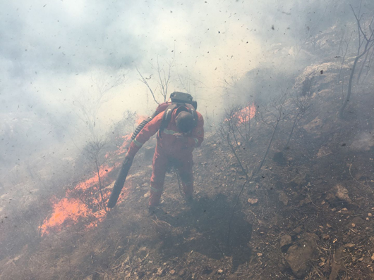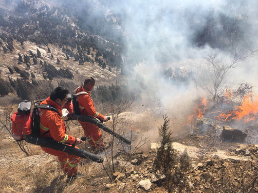 由于火場山體陡峭,碎石、斷坡及帶刺植被較多,大量灌木阻隔而且風向飄忽不定,隊員們行進極其困難,護林隊員幾次被山火裹入其中,很多隊員被刺傷和扭傷,但是大家顧不上傷痛,追趕火頭,頑強與火災做斗爭。由于現(xiàn)場風大火猛煙濃,很多隊員被熏的眼淚直流,個別隊員被火燒焦了眉毛頭發(fā)和衣服,稍不留神就被濃煙和大火困在灌木叢中進退不得,就是在這樣惡劣的條件下,大家眾志成城終于把瘋狂的火災消滅。
