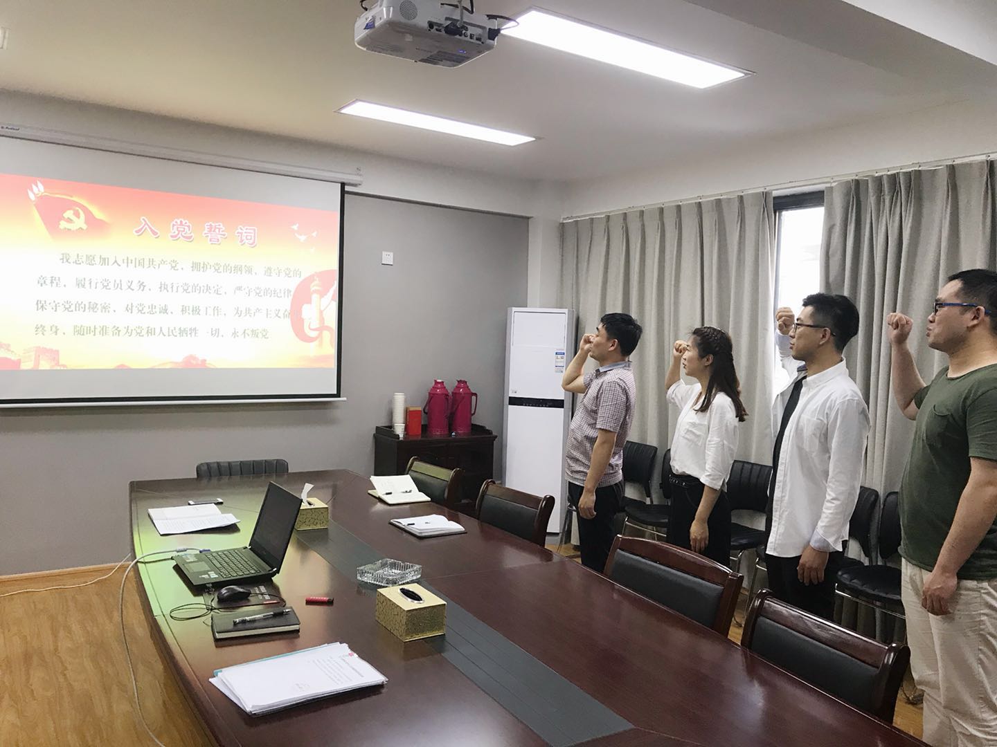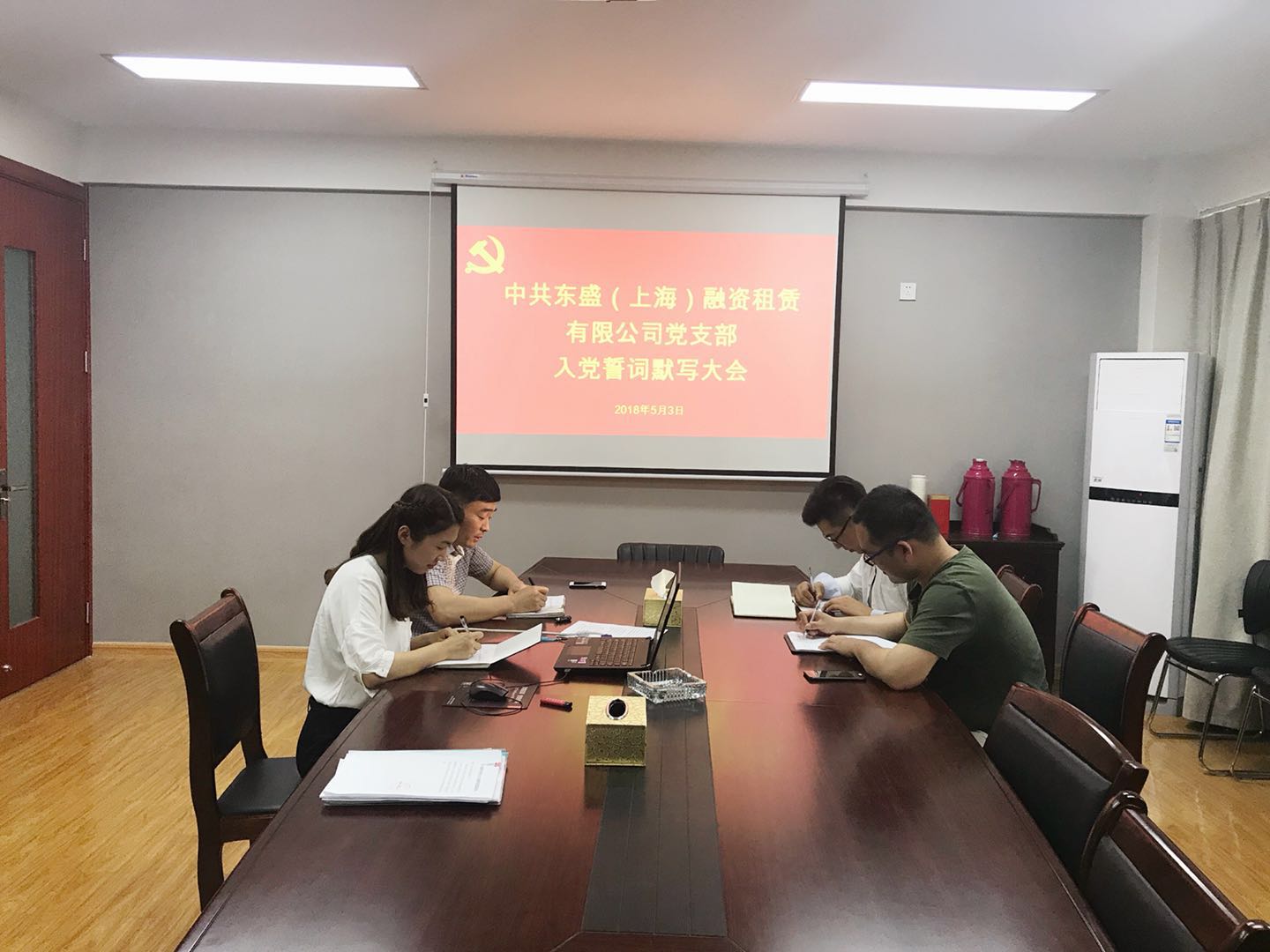 2018年5月3日下午,東盛公司全體黨員在會(huì)議室開(kāi)展“重溫入黨誓詞”活動(dòng),在總經(jīng)理王智的帶領(lǐng)下,面對(duì)黨旗,大家舉起右手,精神飽滿、莊嚴(yán)宣誓,集體重溫入黨誓詞。并在宣誓后,進(jìn)行了入黨誓詞的默寫(xiě)。