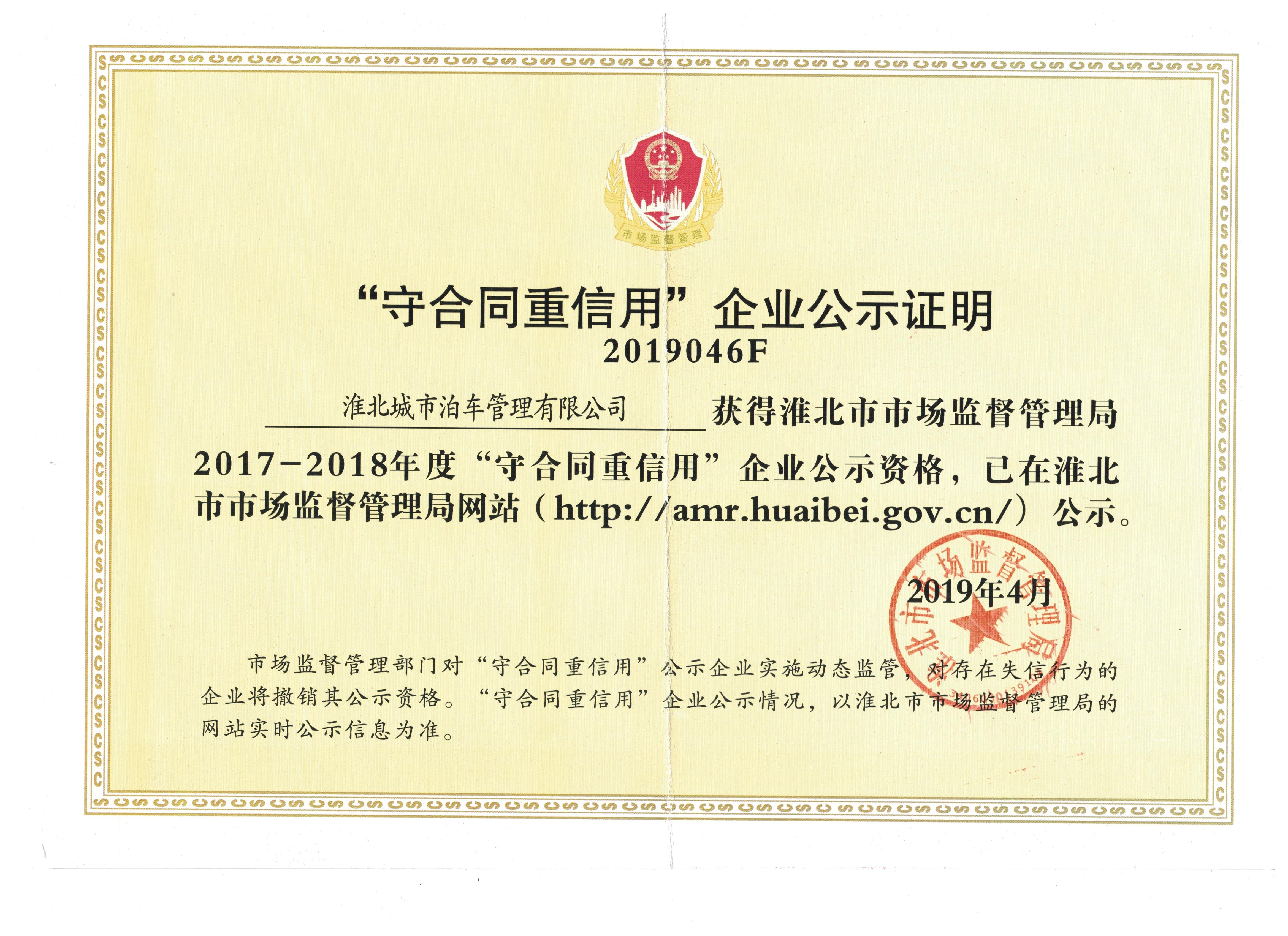 “人無(wú)信不立,事無(wú)信不成”,淮北城市泊車管理有限公司被評(píng)為2017-2018年度“守合同重信用”企業(yè),該信息已在淮北市市場(chǎng)監(jiān)督管理局官網(wǎng)公示。多年來(lái),城泊公司堅(jiān)持以誠(chéng)信作為企業(yè)長(zhǎng)遠(yuǎn)發(fā)展的基石,以“誠(chéng)信經(jīng)營(yíng)”作為公司發(fā)展宗旨,高度重視合同的規(guī)范管理,講誠(chéng)信、重履約,真正做到對(duì)國(guó)家、社會(huì)、消費(fèi)者負(fù)責(zé),得到了社會(huì)各界的廣泛贊譽(yù)和認(rèn)可。